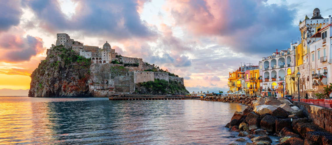 Pastellfarbene Fischerdörfchen, die sich vor dem tiefblauen Meer an die Steilküste schmiegen. Traumwandlerisch schöne Paradiesgärten. Ikonische historische Bauwerke. Italienische Lebenslust, wohin Sie Ihr Weg auch führt. Die Insel Ischia ist eine echte Perle. Trotz ihrer unwiderstehlichen Schönheit ist die größte Insel im Golf von Neapel längst nicht so überlaufen wie vergleichbare Reiseziele. Und das, obwohl die Insel via Autofähre problemlos erreicht werden kann. Wir stellen Ihnen sechs Sehenswürdigkeiten auf Ischia vor, die Sie bei einem Ausflug auf die Insel gesehen haben müssen.