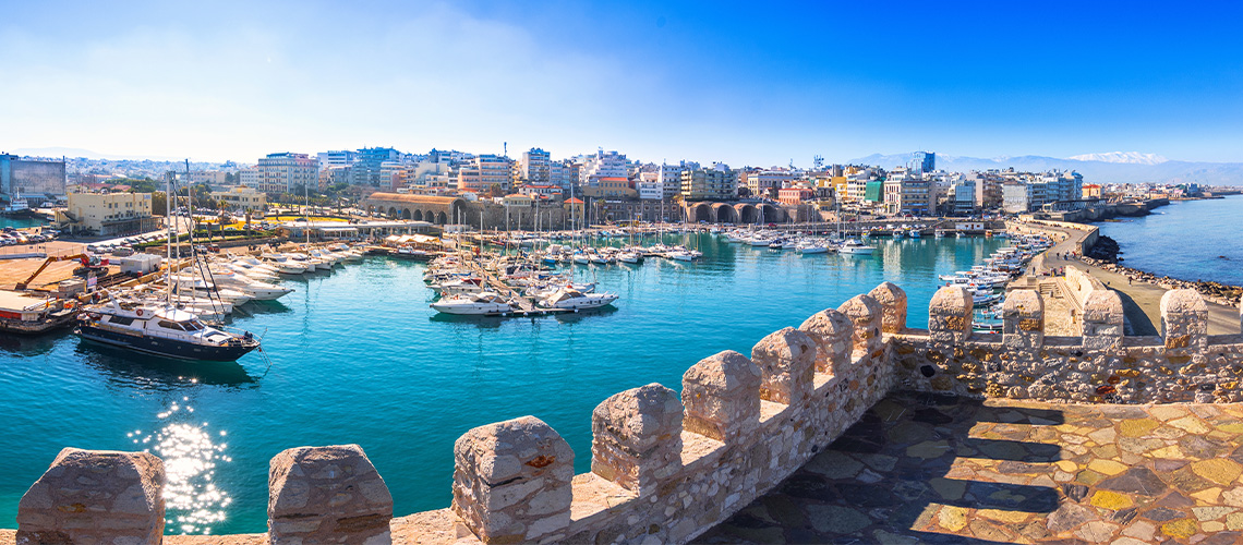 Ihre individuelle Kreta-Rundreise beginnt in Iraklio (Alternativschreibweise: Heraklion). Die größte Stadt der Insel hat viel zu bieten – sowohl innerhalb der Stadtgrenzen als auch in der Umgebung. In der Stadt selbst sollten Sie dem venezianischen Hafen mit seiner charakteristischen Festung einen Besuch abstatten. Und auch die Venezianische Loggia (Rathaus aus venezianischer Zeit) sowie das Archäologische Museum sind einen Besuch wert. Das größte Highlight liegt allerdings einige Fahrtminuten außerhalb der Stadt: der Palast von Knossos. Der vor rund 4.000 Jahren errichtete minoische Palast und die umliegende Ruinenstadt versprechen eine spannende Zeitreise durch die Jahrtausende.