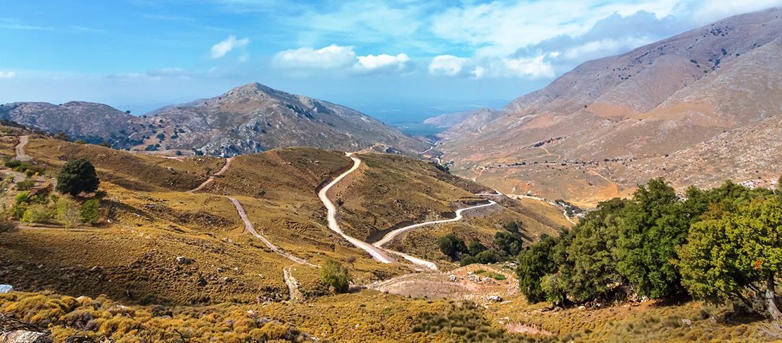 Ihr erster Roadtrip führt Sie auf die Lasithi-Hochebene, wo sich Kreta mit von seiner authentischsten Seite zeigt. Zwischen den majestätischen Bergen des Dikti-Gebirges erstrecken sich grünen Feldern, zwischen denen hunderte weiße Windmühlen in der Sonne funkeln. Auf dem Weg zum Hochplateau empfiehlt sich ein Stopp im winzigen Dörfchen Krasi. Hier können Sie nicht nur hervorragend essen, sondern auch eine uralte Platane bewundern, die hier schon seit mehr als 2 Jahrtausenden stehen soll. Auf der Lasithi-Hochebene selbst empfiehlt sich ein Abstecher zur mystisch-schönen Zeus-Höhle (Höhle von Psychro) oder in den nahegelegenen Themenpark für griechische Mythologie. Alternativ können Sie auch einige der vielen verträumten Bergdörfchen in der Region entdecken. Zum Beispiel Avdou oder Tzermiado.