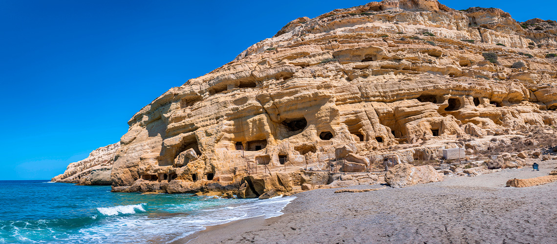 Wissenswertes: In den faszinierenden, jungsteinzeitlichen Höhlensystemen vor Matala siedelten sich in den 1960er Jahren die ersten Hippies an und gründeten vor Ort eine Kommune.