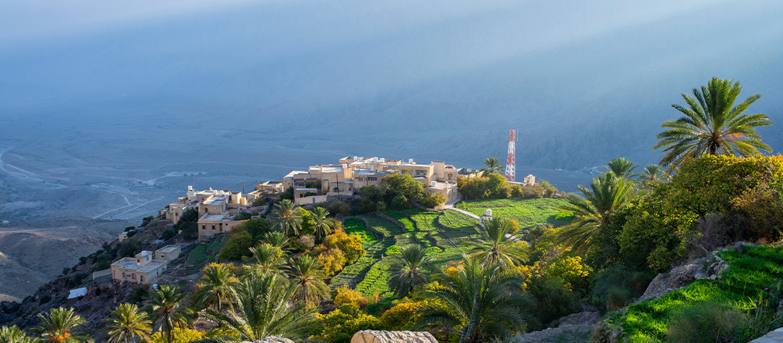 Ihre nächste Etappe führt Sie ins westliche Hadschar-Gebirge. Auf einer spektakulären Strecke (Allrad-Antrieb erforderlich) geht es, größtenteils auf asphaltierten Straßen, bis ins wunderschöne Wakan. Der Blick vom hochgelegenen Bergdorf auf das Tal und die markanten umliegenden Berge gehört zu den denkwürdigsten Panoramen, die der Oman zu bieten hat. Geradezu märchenhaft schön präsentiert sich Wakan von Februar bis Mitte März, wenn die Aprikosenblüte das Dorf in ein weißes Blütenmeer taucht.