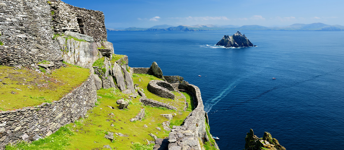 - Skellig Michael: Schon von weitem bietet die felsige, von viel Grün bewachsene Insel Skellig Michael einen ikonischen Anblick. Berühmt sind die steinernen „Bienenkorbhütten“, die einst von Mönchen bewohnt wurden. Eine Treppe führt zum Kloster hinauf und erlaubt einen Blick auf die nicht zugängliche Vogelinsel Little Skellig. Erreicht werden kann Skellig Michael, das als Drehort für „Star Wars“ Berühmtheit erlangte (Lukes Versteck), via Boot. Wichtig zu wissen: Das Anlegen auf Skellig Michael ist wegen des rauen Atlantiks oft schwierig – und bei schwerem Seegang schlicht nicht möglich.